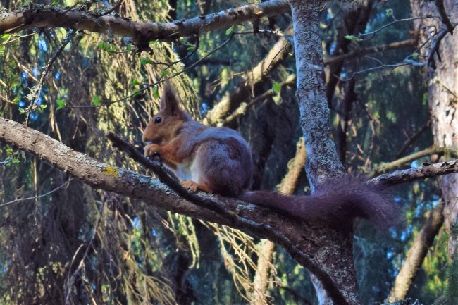 Men jag gick inte där och var sur utan mer målmedveten och envis och jag fick många belöningar i form av ekorrar som tjattrade och snabbt försvann när jag kom närmare. Jag hade dock tur och fick se en ekorre som var så upptagen av sin kotte att viljan att fly var mindre än hungern.
