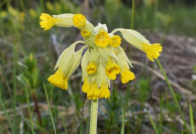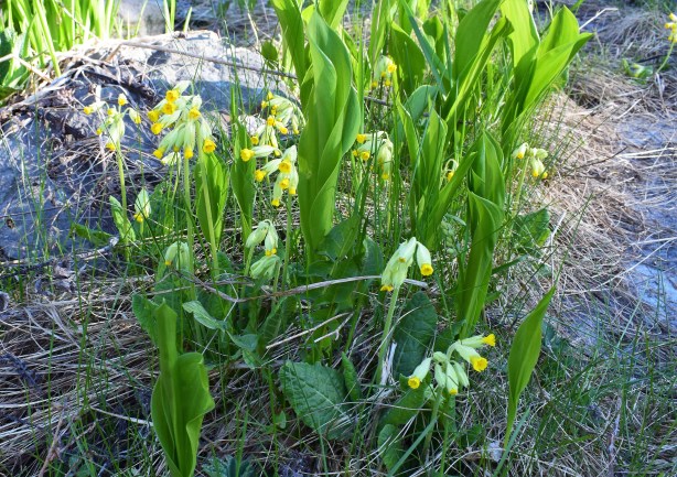 Jag var inte inne i tät skog hela tiden och ibland kom jag till öppna områden och då kändes allt bättre. Här samsas gullvivor och liljekonvaljeblad på en ganska stor yta, en fd trädgård där husgrunden och en del trädgårdsväxter också syntes.