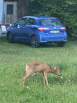 Men först vill jag visa vilka grannar jag har. Min värd kom och knackade på och ville visa mig en bild han hade tagit. Bilden nedan är hans och han var snäll och gav mig den. Tydligen återkommer ett rådjur varje år och får sina ungar i ett skjul framför min bil. Ni skymtar den vita presenningen där de bor. Ett av de två kid som bor där tillsammans med sin mamma kom ut och betade mellan mitt uterum och bilen. Min värd sa att mamman kommer ut varje kväll och äter av det långa gräs som han lämnar varje år. Nu fick jag förklaringen till varför bara gräset utanför mitt boende är klippt. Det verkar som om rådjursmamman vet att hon har en fristad här.