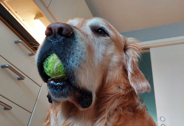När han somnade smög jag iväg för att göra mitt styrketräningsprogram (för att må bra och inte för att bygga muskler) men han vaknade så klart till, hämtade sin älskade boll och satte sig tätt intill mig. Det blev grodperspektiv men han är söt ändå. Jag kunde inte låta bli att klappa och klia honom men när jag slutade och försökte fortsätta min träning borrade han in huvudet i min mage och nästan la sig över hela mig. Det var bara att resignera och kramas lite i stället. Bollen ville han inte låta mig ta. Den skulle han på goldenvis bara ha i munnen.