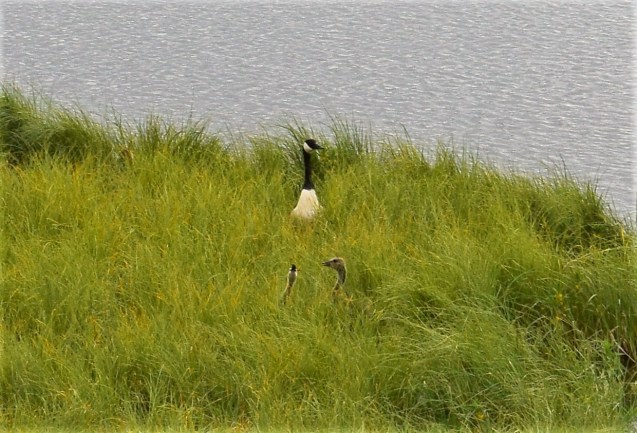 Jag hade inga förväntningar om att kunna fota några fåglar men jag tog mig ändå upp i fågeltornet. Därifrån såg jag familjen kanadagås och den bilden får i alla fall duga.