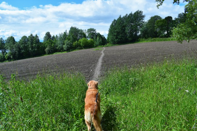 Kampen mellan markägaren och alla som vill gå, springa eller cykla här går vidare. Nu har det återigen blivit en upptrampad stig och jag såg att det var likadant längre ner på åkern. Jag och Vilde gick fram till nästa lilla grönområde och där såg vi att stigen fortsatte även över nästa åker. Men där var det ganska lerigt så vi vände och gick hemåt. Jag tänkte att vi kunde gå ner till sjön så att Vilde fick bada lite men plötsligt kom det mörka moln och regnet satte igång igen. Då valde vi att ta oss inomhus i stället.