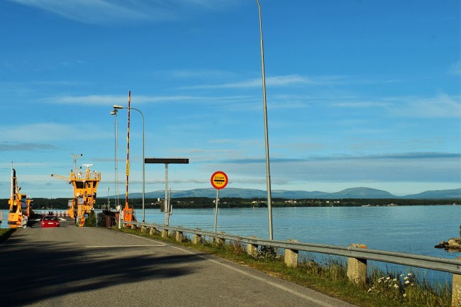 En kvart efter att färjan åker mot Norderön åker nästa färja från andra sidan Norderön mot Håkansta på fastlandet. Det är precis att man hinner ta sig över ön och köra ombord på färjan innan den lägger ut. Här hann jag ändå sakta ner och fota de fjäll jag var på väg mot. Drommen är det rundade fjället och ni känner nog igen siluetten vid det här laget.