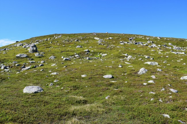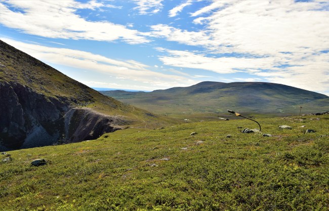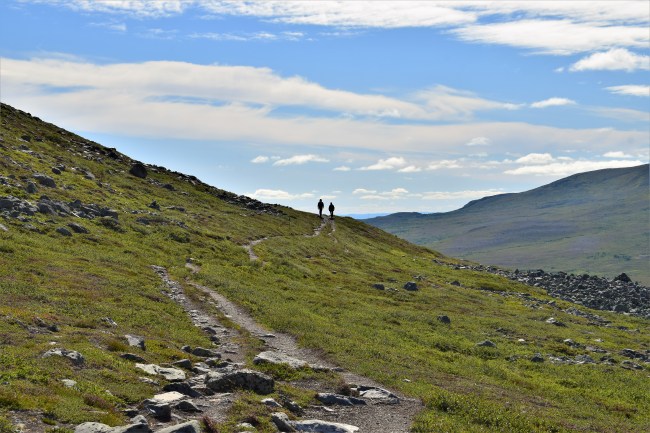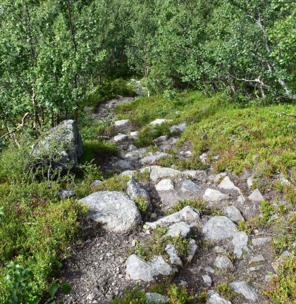 Jag mötte ett gäng som var på väg upp och jag önskar att de hade berättat hur leden såg ut längre ner. Men de sa bara att det fanns en rastplats vid bäcken där nere och sedan pratade vi om väder, vyer och lite annat. Jag önskar också att jag hade vetat att jag skulle ha fortsatt ner till början av Dromskåran där nere och gått samma väg ner som jag gick upp. Men jag visste inte det och fortsatte alltså på den stig jag var på, glad att det nu inte var mera uppförslutningar att kämpa i. Jag har varit vid Dromskåran några gånger förut men fortsatt mot Falkfångarfjället i stället.