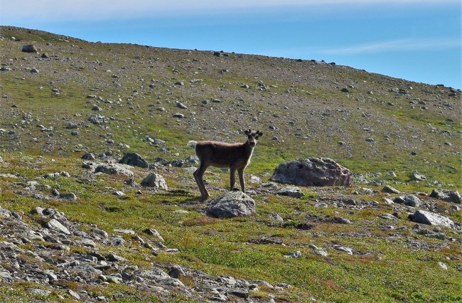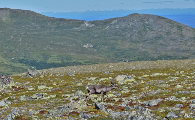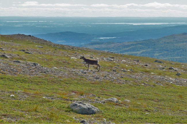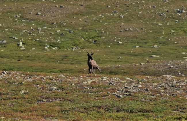Jag satte mig ner på en sten uppe på toppen och rätt som det var kom en ren springande. Men den här gången såg jag ingen kalv. Den här renen verkade inte ens märka att jag satt där.