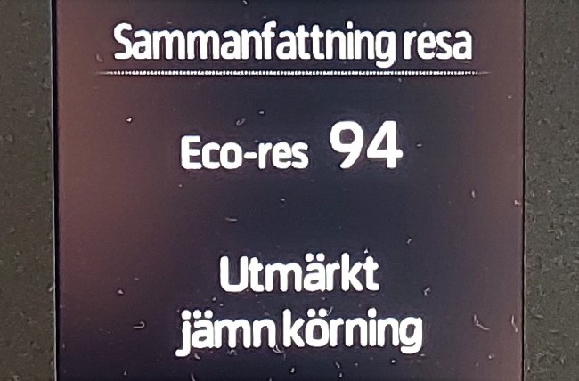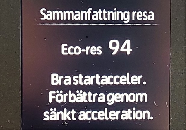 Min nya bil gör sitt bästa för att få mig att bli en bättre, mer ekonomisk och miljövänlig förare. På två displayer visar den olika uppgifter som ska hjälpa och påverka mig under färd… och påverkad blir jag. Ni förstår förhoppningsvis att jag inte på riktigt tror att det är bilen som betygsätter mig. Även om jag har förmänskligat min bil genom att döpa henne till Fuchsia så vet jag att hon är programmerad till att låta olika algoritmer tillsammans landa i en bedömning varje gång färden tar slut. En liten bild i den större displayen visar om det är motorn eller batteriet som driver bilen och den visar även när varken batteri eller den bensindrivna motorn gör av med energi och då fylls i stället batteriet på. När jag ser detta så kan jag i vissa lägen påverka bränsle- och batteriförbrukning och det gör mig till en miljövänligare förare. Då kan jag få följande bedömningar när vi har stannat. Som ni ser får jag även tips om hur jag ska bli ännu bättre. Än så länge har jag en bränsleförbrukning på i snitt 0,38 l per mil i blandad körning. Min förra bil drog ca 0,5 l per mil så jag är ganska nöjd.