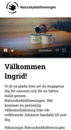 Jag har länge tänkt på att bli medlem i naturskyddsföreningen men har inte kommit till skott förrän för några dagar sedan. Som tack för min ansökan om medlemsskap fick jag ett mail med en personlig välkomsthälsning. Hur personlig den är kan nog diskuteras men det är i alla fall mitt namn på muggen som fylls med kaffe och även i texten nedanför. I filmsnutten sägs även ”hej Ingrid, vad glad jag är att just du har valt att gå med i naturskyddsföreningen”. Det känns ganska personligt och en liten ansträngning har i alla fall gjorts för att få med mitt namn. Ett smart sätt att få nya medlemmar att känna sig välkomna. Det går inte att se filmen eftersom det här bara är en skärmdump. Den korta filmsnutten avslutades med ett tack och det var ju också trevligt.