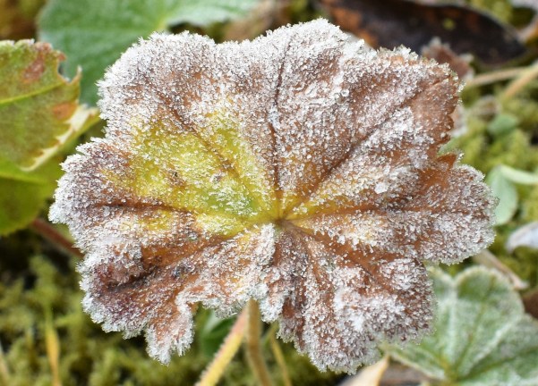Framme på parkeringen började jag med att swisha de 20 kr det kostar att stå där en dag och sedan tog jag på mig mössa och vantar (premiär för säsongen) och gick iväg. Ett frostnupet blad fick bli höstens första frostmotiv.