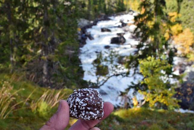 Och grattis till trattisarna! Tur du hade stövlar .. fina röda också som matchar hösten. Pausen vid forsen känns mäktig med brusande vatten och … chokladboll 🙂