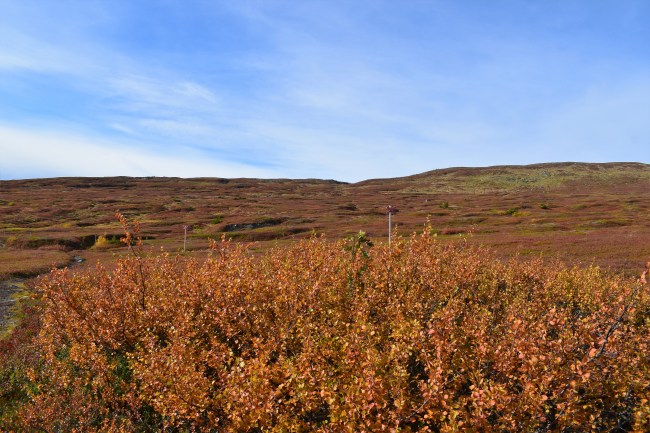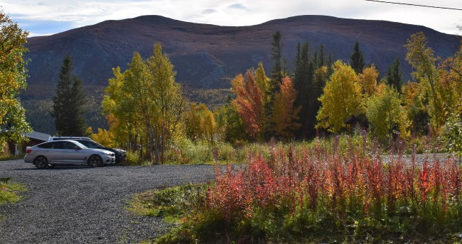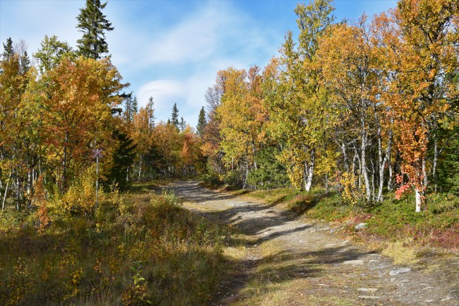 Den vägen går bara till fjällen och just nu är det inte säsong och därför är det inte många bilar där. Men jag stannar bara om jag har bra sikt både framåt och bakåt. Vi har inte haft någon riktig frostnatt än men lite antydan till frost har jag sett någon morgon. Men frosten kommer oftast tidigare till fjällen. Jag kunde ganska snart ta av mig mössa och vantar för temperaturen steg upp till mellan 10 och 12 grader.