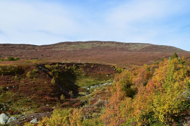 Jag kom tillbaka till parkeringen och mer än så hade jag egentligen inte tänkt göra den här dagen. Jag hade gått ca 5 km och kroppen kändes fortfarande ganska pigg. Jag kunde bara inte åka därifrån utan att ha varit uppe en bit på ett fjäll och njutit av alla höstfärger. Inget är så vackert som fjällen i höstskrud. Men jag ville inte göra en ansträngande vandring ända nerifrån dalen så jag styrde mot Fjällhalsen, som ligger en bit upp och där det finns både restaurang och parkeringar. Vägen upp är rejält brant men min Fuchsia klarade det galant. Härifrån tänkte jag att jag i alla fall skulle ta mig upp på kalfjället och sedan känna efter om jag orkade mer. Mittemot parkeringen ligger Drommen, en av de fjälltoppar jag besegrade i somras.