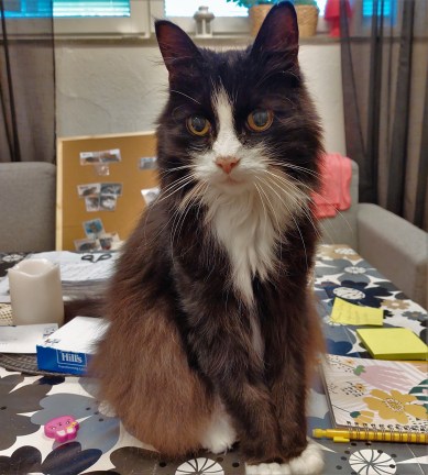 Prinsen har fått sällskap i köket. Det här är Tusse och han vill gärna gosa så där har Prinsen fått lite konkurrens. Två andra katter får också gå fritt i köket men de är mer skygga och gömmer sig uppe på taket till ett av båsen. De tycker att de bor där och därför får de också sin mat placerad där uppe. Det är lika bra det eftersom Prinsen är njursjuk och bara får äta specialkost. Tusse får däremot sin mat placerad på någon höjd, antingen på bordet eller någon klätterställning. Prinsen kan inte ta sig upp utan hjälp så det fungerar också bra. Den enda som riskerar att få dela med sig av sin mat är just Prinsen eftersom han får den på golvet. Ja, inte direkt på golvet så klart utan på fat. Nu borde jag nog ha med en bild på Prinsen men ni har sett honom förut. Tusse får representera köksgänget. Tyvärr verkar de inte bry sig särskilt mycket om varandra men de accepterar varandra och får därför den större frihet som köket innebär.