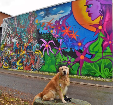 Men jag är ju även hundmänniska och kanske lite mer än kattmänniska. Jag har tagit några pass på katthemmet tillsammans med den kvinna som ofta hjälper till att rasta Vilde, den superfina golden retriver ni har sett mig med tidigare. Hon berättade att hon hjälper till många dagar i veckan och då sa jag att Vildes matte vet att jag också gärna går ut med honom. Jag gissar att hans matte drar sig lite för att vara besvärlig och be mig om hjälp så jag skrev till henne och föreslog att jag skulle ta en promenad med Vilde på torsdagen, som är idag. Så blev det och både Vilde och jag var lika glada när jag låste upp dörren och gick in. Men efter en lång stunds gosande satte jag på honom kopplet och så gick vi iväg. Höstfärgerna lyser upp överallt men vi hittade något annat som också var färgsprakande. Där poserade Vilde snällt. Han är jätteduktig på kommandona sitt och stanna och dessutom drar han inte alls i kopplet. Det är en förutsättning för att jag ska kunna gå med honom. Kanske har det faktum att han är drygt 10 år med det att göra men han är både pigg och stark så jag tror att han bara är snäll och väluppfostrad. Han drar inte ens i kopplet när vi möter andra hundar. Det kan komma något lite gnäll men han nöjer sig med det.