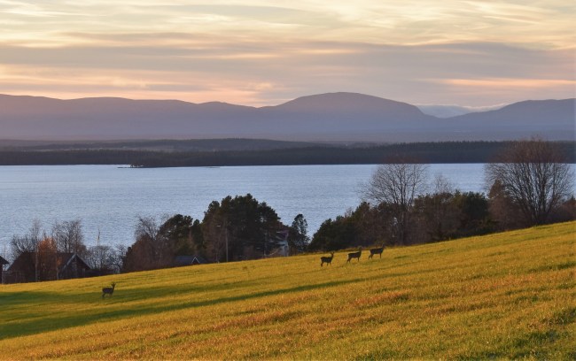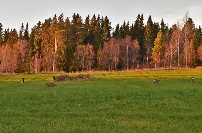 Jag har lagt in foton från föregående vecka och som ni ser är det många rådjur överallt nu. Just här trodde jag också att det bara var rådjur men så reagerade jag på de vita, långa benen på några av dem. De var ganska långt borta men jag såg ändå att det var två älgar med i motivet.