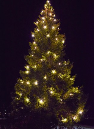 Jag ska lämna prover var tredje månad och i kallelsen jag fick blev jag uppmanad att lämna dem under december månad. Det är bra att jag kan välja själv när det passar och i morse kändes det som en bra dag att ta mig till sjukhuset. Jag kan lämna på min hälsocentral, som ligger närmare, men där måste man boka tid och det tar alltid flera veckor. På sjukhuset är det bara att komma och anmäla sig och sedan sitta ner och vänta. Jag blev inspirerad av vännen Anna-Lena, som i sin blogg visade bilder på två av stadens granar och därför parkerade jag där jag ofta ställer bilen och promenerade längs sjön, över gångbron och sedan vidare via Stortorget och till sjukhuset. Klockan var sju när jag började gå så det var mörkt ute. Den första granen passerade jag snart, där den stod vid gångbanan.