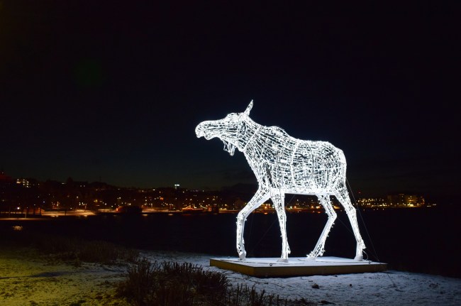 Ja vilken färgbomb du bjuder på! Eller första bilden är det ju naturen och himlen som står för skådespelet men sedan har nog människan fått hjälpa till på traven. Fantastiskt vackert på torget vid ‘Rådhuset! Och jag tittat mer än gärna på älgen och granarna varje år! Mitt minne sträcker sig inte så långt men älgen den minns jag för den är så speciell! Härligt att du har fått en femårsstämpel snart! Jag hoppas att läkaren imorgon kan variera mina mediciner lite så jag kanske slipper vissa besvär som jag tror kan vara läkemedelsbiverkningar. Kylslagen men varm kram
