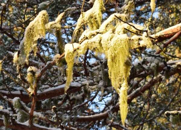 Någon gång ibland har solen tittat fram och lyst upp min värld. Den här skägglaven hängde vid en liten glänta och den såg ut att trivas i solskenet.