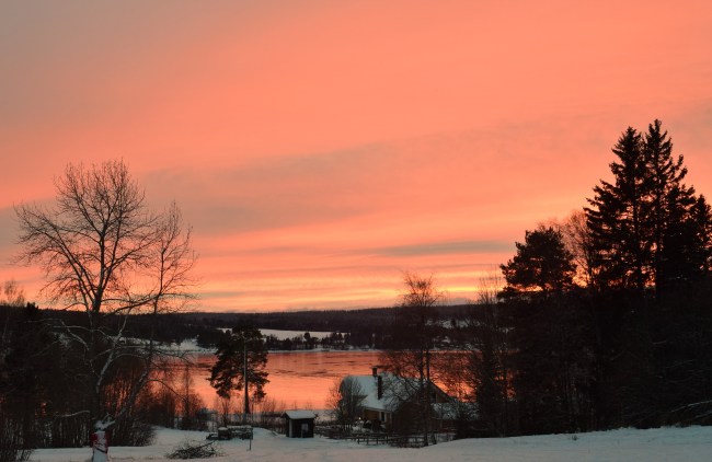 Jag hade inte tänkt på att jag skulle vara ute när solen gick ner. Men ganska exakt vid solnedgången, som var kl 14.19, kom jag ner till sjön och såg hur färgen från den försvinnande solen började visa sig.