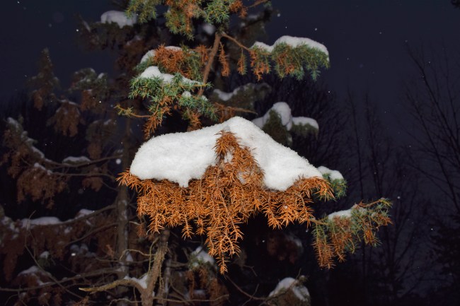 En morgon gick jag ut innan det hade ljusnat och när jag såg en älg och flera rådjur konstaterade jag att det var alldeles för mörkt och dessutom för stort avstånd för bra bilder. Men lite kul blev det i alla fall när jag använde blixten och snöflingorna syns som ljusklot.
