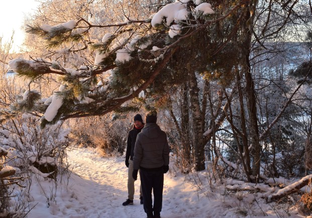 Det var en härlig vintermorgon och vi var helt överens om att vi ville gå ut i den vackra, vita vintervärlden. Jag frågade om mina barn ville se älgar och det ville de så vi vandrade iväg mot Sommarhagen. Vi såg bara en älg men den kom vi ganska nära. Den stod och åt lite på några grenar, tittade på oss en stund och fortsatte sedan mumsa. Vi såg rådjur också men det gör jag nästan varje promenad.