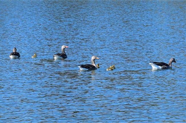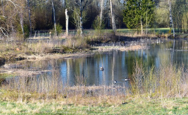 Jag vaknade upp i villavagnen i Varnhem och när jag tittade ut såg jag att den lilla vattensamlingen hade fått morgongäster. Jag tycker mig se att det är kanadagäss men avståndet är för stort för att jag ska vara helt säker.