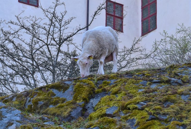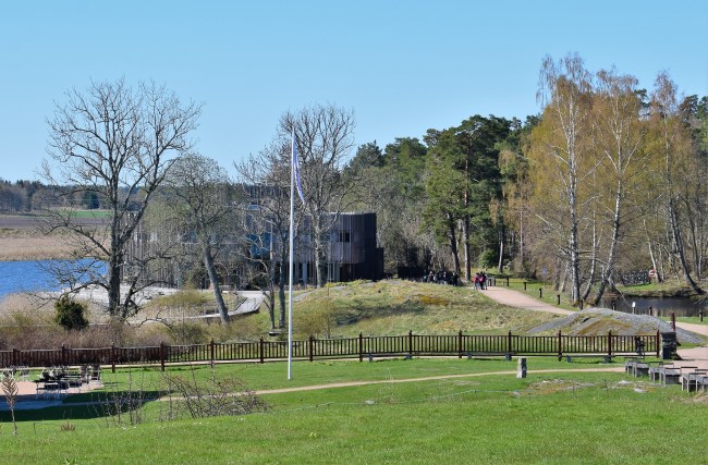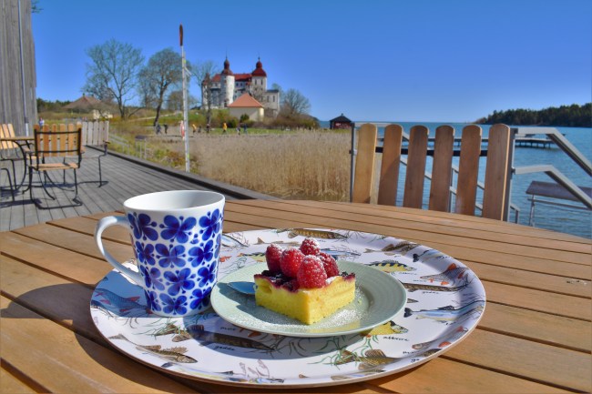 Fler foton än de två blev det inte inomhus men jag kunde inte låta bli att fota min fikastund i solen utanför. De hade flera veganska bakverk och jag kunde ganska snart konstatera att jag valde den bästa och godaste kakan. En lite ljummen vaniljkaka, inte alls så söt som jag fruktade, toppad med hallon och florsocker. Jag satt där och njöt i lä och i varma solstrålar. Förra gången vi var här fikade vi utanför det lilla huset framför slottet och jag tror inte att naturum fanns då.