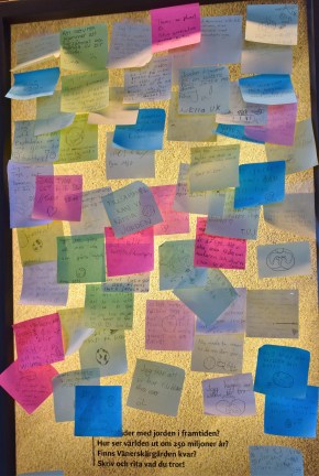 …och en tavla där barn har fått sätta upp lappar med funderingar om vad som ska hända med oss och vår jord i framtiden. Kul och intressant att läsa vad de har skrivit.