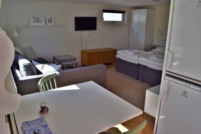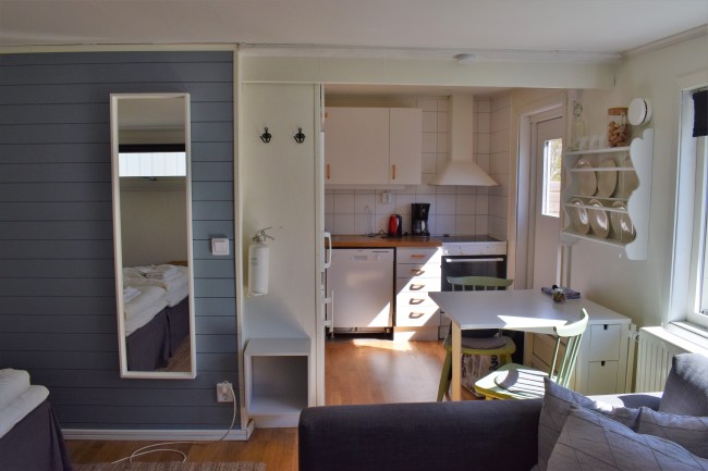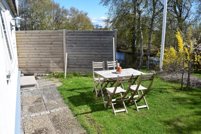 Jag fick ett meddelande från min värd att det gick bra att checka in så jag behövde inte fördriva den halvtimme, som egentligen var kvar, med något annat. Det är visserligen inte svårt att hitta något att uppleva här i Lysekil men det kändes väldigt lockande med en kopp kaffe och en stunds vila. Även här hade jag bokat via airbnb och nu var det en ganska stor skillnad på standaden. Jag var nöjd med villavagnen men här är det ändå snäppet bättre. Jag tog med mig en kopp kaffe ut i solen, ställde en av stolarna mot väggen och njöt av värmen.