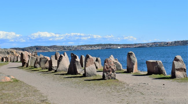 Stenbumlingarna utmed promenaden från Vikarvet till Pinneviksbadet påminner om bautastenar i järnålderns gravfält.