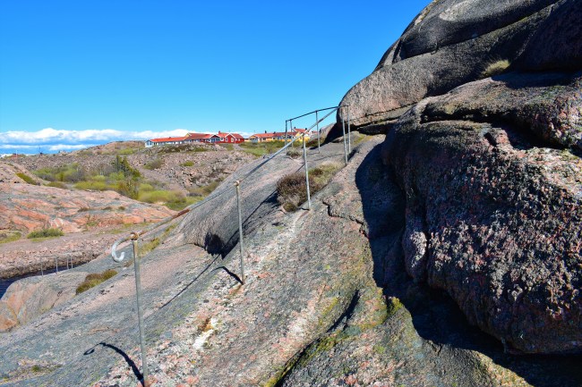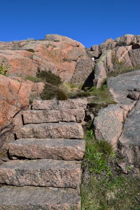 Den här leden känner jag till sedan flera gånger förr. Jag, min man och hundarna har vandrat på klipporna och njutit av härliga vyer. Att gå uppför i trappor är inga problem och jag ignorerade tanken på hur besvärligt det är att gå nerför trappor. Det är klart att jag tog mig upp för här gick det inte att stanna och vända om. Då hade jag ångrat mig senare.