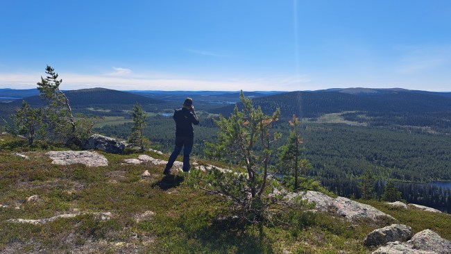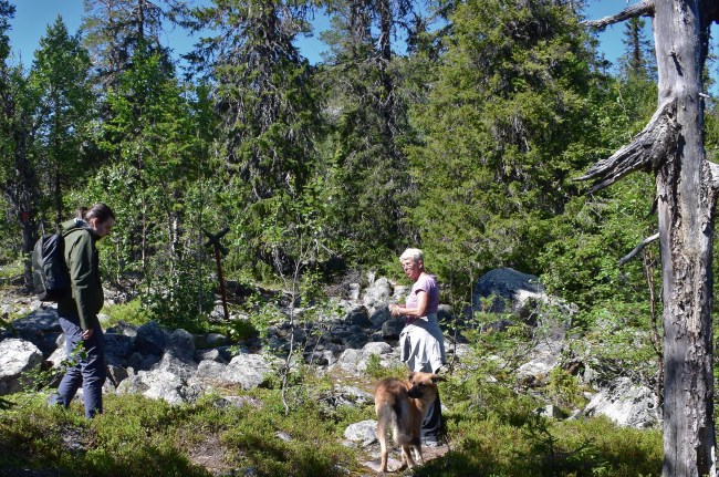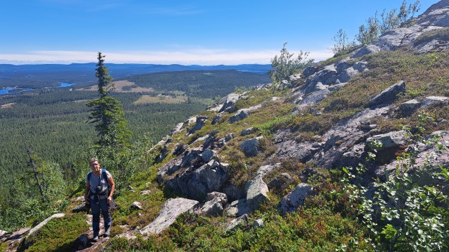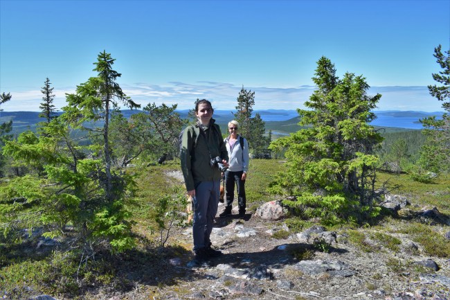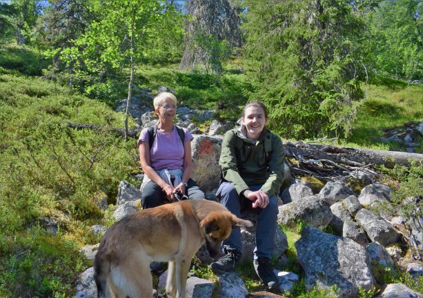 Man måste ta paus från klättrandet ibland och bara sitta och njuta en stund. Myggmedel behövdes och jag hade inga som helst problem med de små surrande blodsugarna. Men mitt sällskap var för frestande för en del myggor för att medlet skulle hindra dem. Kanske fick jag också något stick men det kände jag inte och numera får jag så gott som aldrig något synligt märke efter myggbett. Stackars Rocky hade tyvärr en del bekymmer och högg efter både myggor och bromsar.