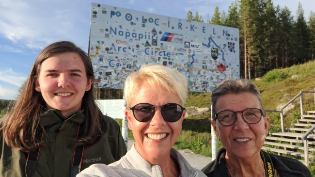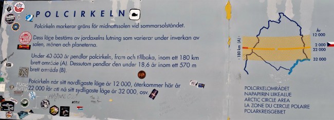 Nu var det bara sista biten kvar på dagens etapp men när vi passerade polcirkeln stannade vi och poserade vid den tyvärr nedskräpade skylten. Varför måste folk göra så här? Massor av klisterlappar dolde skyltens innehåll.