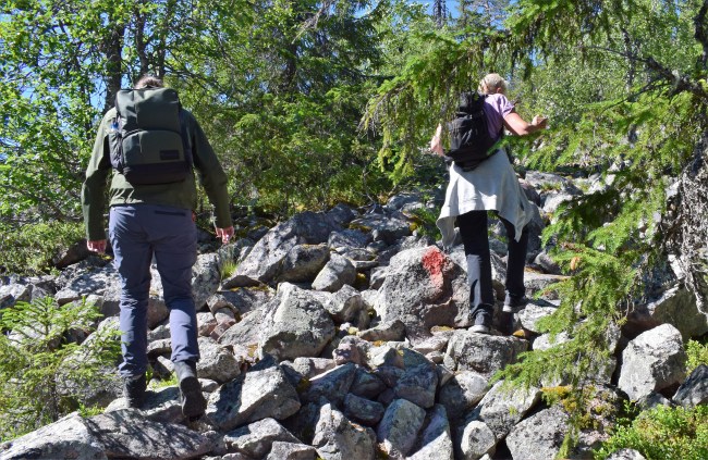 Den här dagen hade vi mer tur med vädret än vid vandringen dagen innan. Solen sken men temperaturen höll sig som tur var på en ganska sval nivå. Leden var enklare att ta sig fram på den här dagen men bitvis var den både brant och stenig. Rocky, som aldrig vek av många meter från leden och oss (framför allt inte långt från sin älskade William), fick vara lös för att förenkla för både honom och hans matte. Han är alltid så lydig men får ändå ofta gå i koppel för att inte skrämma någon vid möten.