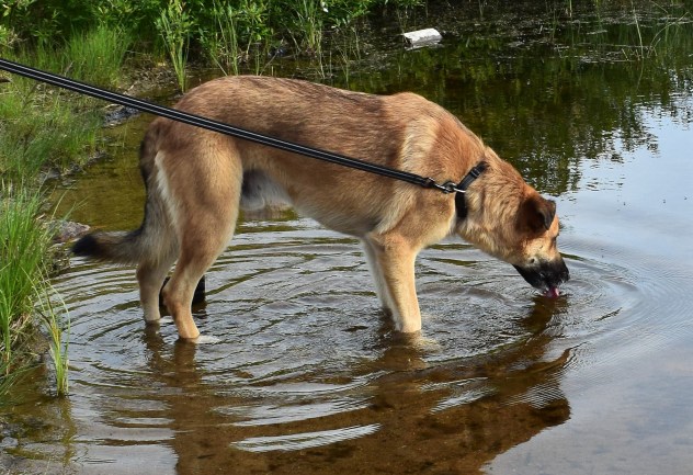 Nästan framme vid parkeringen fick Rocky chansen att blöta tassarna och dricka sig otörstig. Min syster bär alltid med sig vatten i en flaska och en liten skål till honom för säkerhets skull men oftast har vi hittat vatten i naturen.