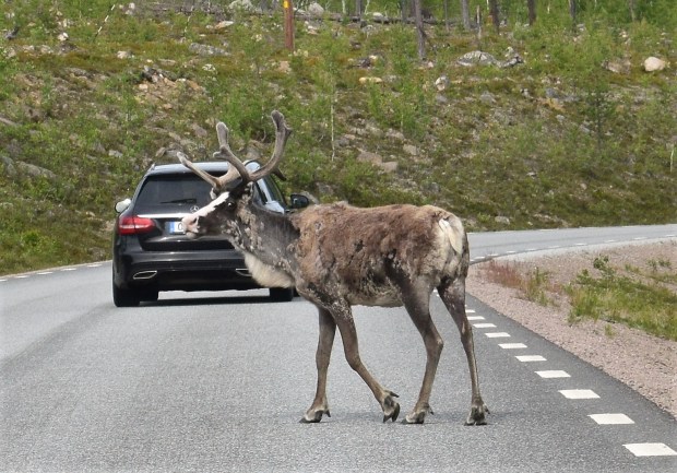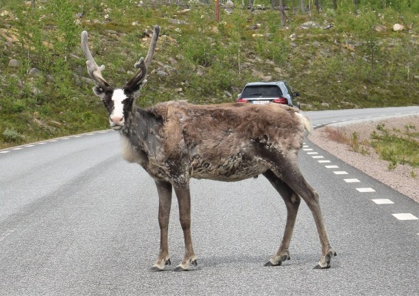 Ännu fler djur och nu började de renar, som vi redan från första dagen hade spanat efter, dyka upp. Det kommer massor av renbilder i kommande inlägg så ni kommer att få mer än nog av de fina djuren. Den här renen gick så fint på sidan av vägen tills den fick för sig att visa sin makt och stoppa trafiken. När den tyckte att vi hade fått vänta tillräckligt länge, eller om den bara var snäll och stälde upp som motiv, fortsatte den på sidan av vägen. Tydligen är renarna mitt i den period då de fäller pälsen så de flesta ser lite ruffiga ut.