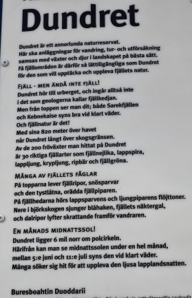 Den här dagen passerade vi Gällivare och det jag visste om Gällivare var att Dundret ligger precis utanför. I stället för att jag ska skriva ner en massa fakta lägger jag in en bild på text som förklarar. Men jag konstaterar att trots fjällnatur räknas Dundret inte som ett fjäll utan som urberg.