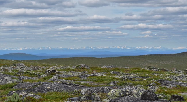 Om ni läste texten om Dundret så minns ni kanske att man kan se både Sarekfjällen och Kebnekaise härifrån. Kanske är det några av de fjällen som svagt skymtar långt där borta.