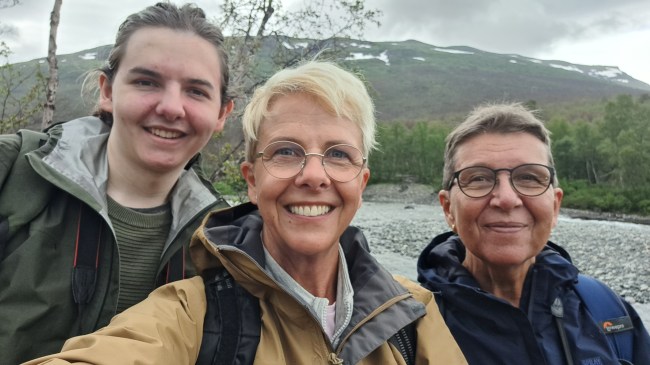 Dags för den dagliga (nästan) selfien. Marken sluttade så därför ser jag mycket kortare ut. Det skiljer en cm mellan oss systrar och inte så mycket som man kan tro när man ser bilden. William däremot är betydligt längre än någon av oss tanter.