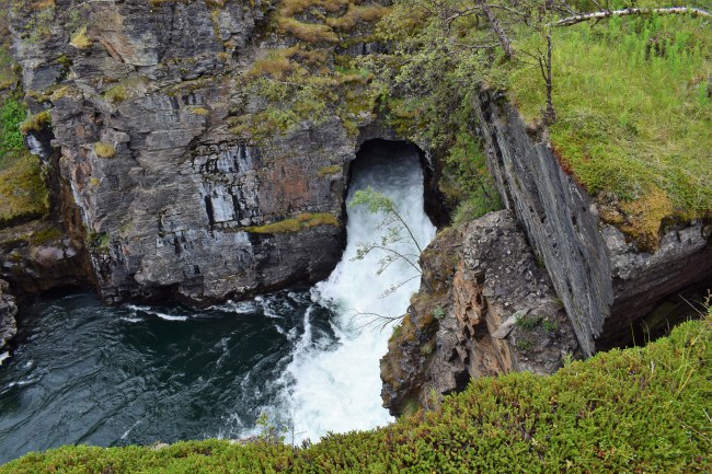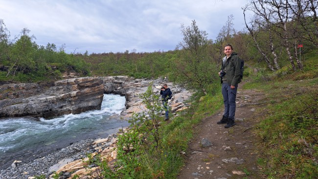 Men vi gick inte genom tunneln utan fortsatte åt andra hållet och kom fram till den plats där älven Abiskojåkka tar sig vidare från ett sprängt hål genom berget under vägen…