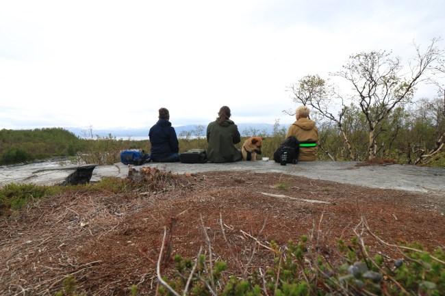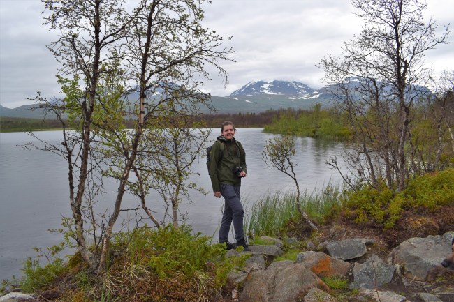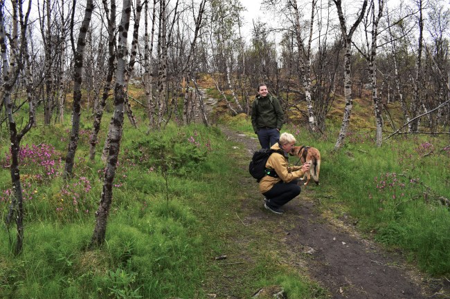 Vi kom tillbaka till turiststationen, där vi så klart passade på att besöka toaletterna, och vi tog bilen några minuter för att på andra sidan vägen gå en fin led mot den lilla sjön Vuolep Njakajaure. Vi gick växelvis genom fjällbjörksområden och öppna ytor och det fanns mycket att titta på och fotografera.Här är det nog alla rödbläror bland de små björkarna som är i fokus för min syster.