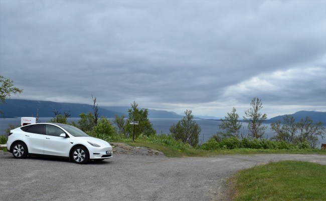 Strax efter Abisko ligger Björkliden och där ligger en av de vackraste laddplatserna för Teslor som vi besökte. Just Tesla har ett väldigt bra utbyggt nät av sk superchargers även i hela norra Sverige så det var aldrig några problem att hitta dem. Vi behövde aldrig köa heller. Även andra bilar kan utnyttja de här laddstationerna men då måste de ha en särskild app eftersom de inte blir igenkända av systemet så fort sladden sätts i. Det gick både snabbt och var väldigt enkelt att ladda bilen. I Norge var det minst lika tätt mellan laddstationerna och där är tydligen Tessla ett väldigt vanligt bilmärke. Lite synd att vi inte hade bättre sikt här.