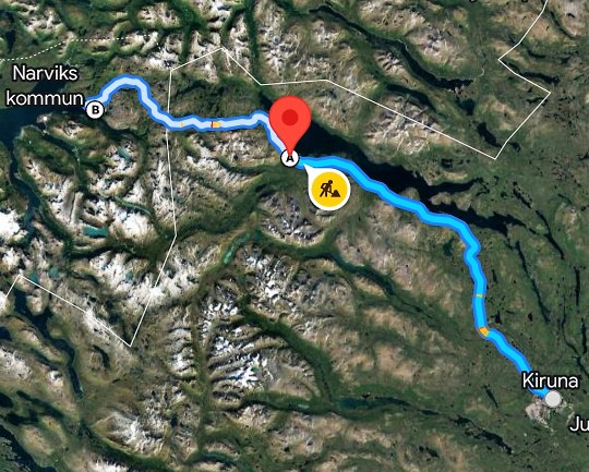 Den här dagen hade jag sett fram emot för nu skulle vi komma in i den riktiga fjällvärlden, något som ni vet att jag gillar. Min syster (Gunnel) och hennes son (William) hade aldrig varit här tidigare men för mig var det minst tredje gången jag åkte den här sträckan. Jag vet inte riktigt om jag som barn kom hit så därför är jag lite osäker. Den långa sjö vi åkte längs med heter Torneträsk och är Sveriges sjunde största sjö. Lite synd är det att den har fått ett så trist namn för det finns inget som påminner om ett träsk med den. Som ni ser passerade vi norska gränsen den här dagen och då kändes det som om vi närmade oss målet. Men det var ännu väldigt långt kvar till Nordkap. Den röda markeringen visar var Abisko turiststation finns och där tillbringade vi ett antal timmar med att vandra och njuta av allt.