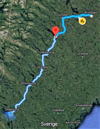 För sista gången upprepar jag nu att det var jag, Gunnel (min syster), William (Gunnels son) och Rocky (Gunnels hund) som gjorde den här fantastiska resan tillsammans. Sista etappen, för min del hemresan, var 46 mil lång och vi hade inget inplanerat förutom bara själva resan, Vi förstod redan innan vi gav oss ut på det här äventyret att vi skulle ha hemlängtan sista dagen och vi hade helt rätt i det. Men vi stannade ändå till vid Café utsikten i Storuman eftersom vi vid besöket där (dag 2) såg att det fanns fina promenadstigar. Storuman ligger vid röda markeringen.