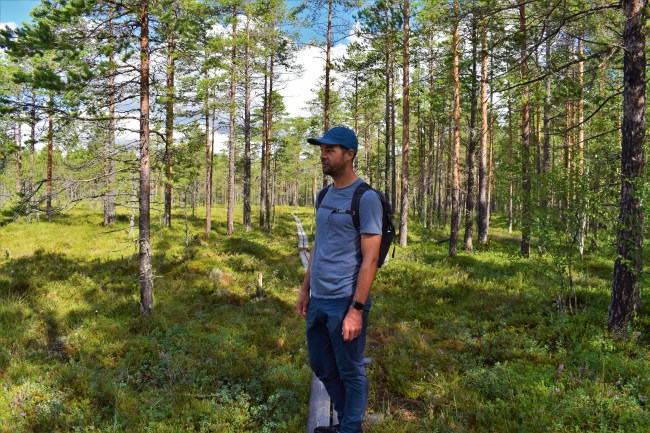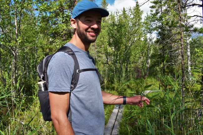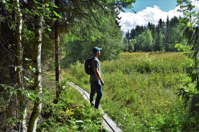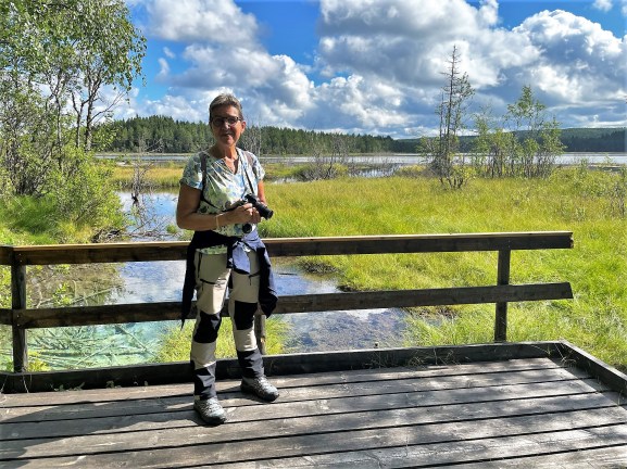Vi fortsatte vår vandring och mestadels gick vi på spångar. Det var lite lurigt emellanåt eftersom regn hade gjort spångarna hala och för att inte halka spände jag både fötter och ben. Men hellre spångar än att bli helt blöt om fötterna.