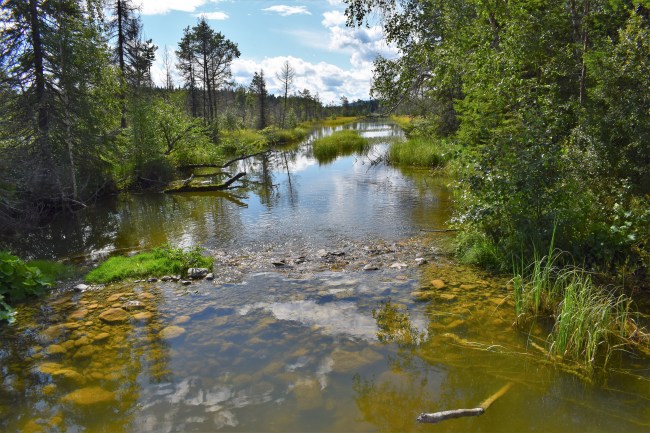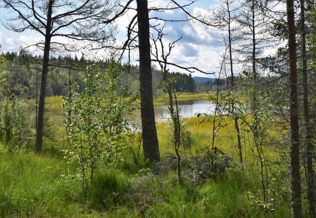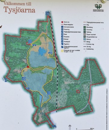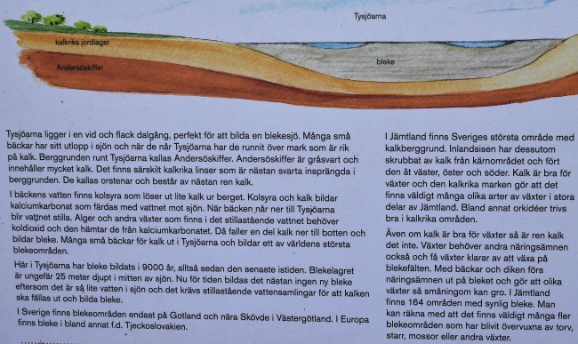Igår däremot var vädret på vår sida och jag föreslog ett utflyktsmål som jag underligt nog aldrig hade besökt förut. Bara ca en kvarts bilresa från mig ligger en av parkeringarna vid Tysjöarna och dit åkte vi. Tysjöarna är blekesjöar och om någon blir nyfiken på vad det är så kan ni läsa om det i bilden nedan. Den förklarar processen bra men sedan blir det lite förvirrande när det först står att bleket här har bildats i 9000 år och sedan påstås det att i Sverige finns bleke endast på Gotland och nära Skövde. I sista stycket står det sedan att det i Jämtland finns 164 områden med synlig bleke. Jaja, det kan inte alltid bli helt rätt.