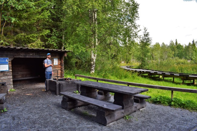 Vi kom fram till en grillplats och där gick stigen ihop med den del av rundan som är tillgänglighetsanpassad. Sådana satsningar gör mig alltid glad. Här tog vi en liten fikapaus. Men kan ni förstå hur vi kunde glömma chokladbollarna? Nåja, det gick bra ändå.