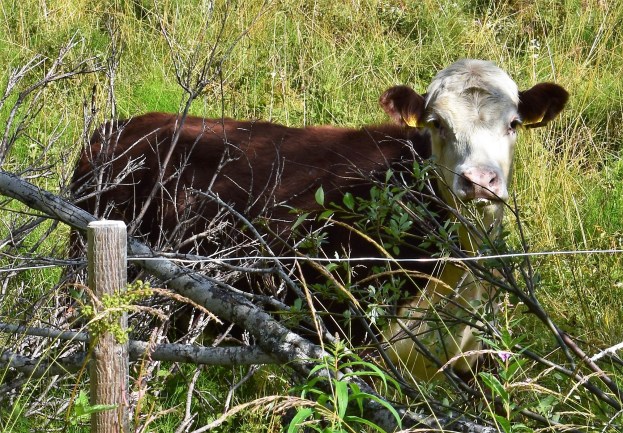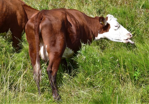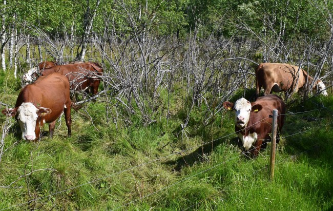Vi följde den breda spången vidare runt den norra sjön och kom förbi stora hagar med kossor, kvigor och många kalvar. Kanske fanns det någon vuxen tjur där också men vi såg bara tjurkalvar.