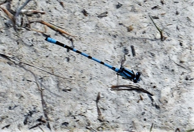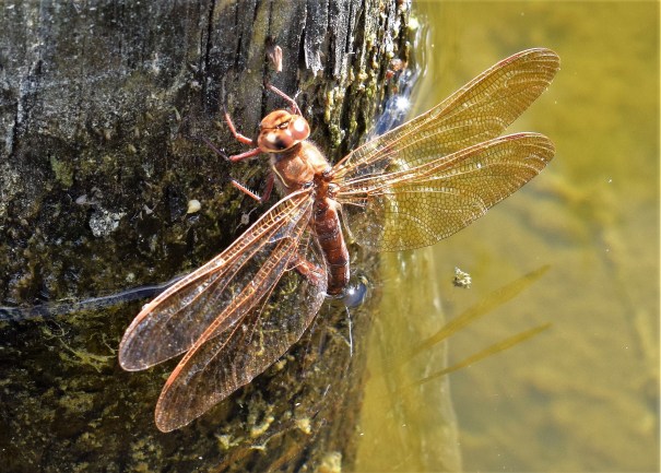 …och förutom vatten på båda sidorna såg vi en stor slända som verkade placera sina ägg precis under vattenytan mot träpålen. Den blå sländan, och många likadana, flög omkring lite längre fram där kalken var väl synlig.