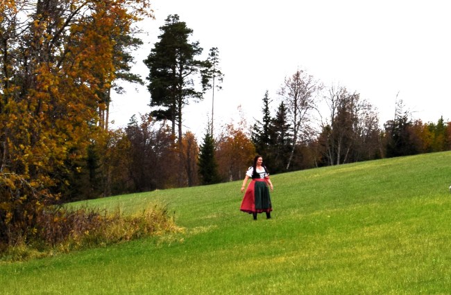 För några dagar sedan, när jag var ute och promenerade, gick jag förbi en kvinna som tog sig fram något långsammare än jag. Vi hejade så klart och hon frågade vart de olika stigarna leder. Jag stannade till för att berätta lite om det hon undrade och sedan gjorde jag mig redo för att fortsätta. Men då fortsatte kvinnan att prata om ditt och datt och frågade även om jag hade någon tid att passa. Det hade jag inte så jag stannade kvar för en pratstund. Medan vi stod där kom en tjej i folkdräkt gående och ställde upp sig för fotografering. Det var inte en temperatur då man gärna går så här lättklädd men vad gör man inte för konsten. Jag passade också på att lyfta kameran men avståndet var långt och mer än så här kan jag inte beskära bilden.