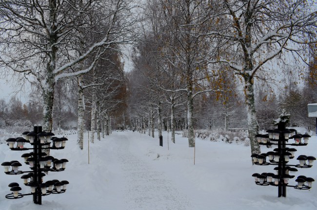 Allhelgonahelgen betyder inget för mig. Det finns flera andra datum som är viktigare men ibland får jag för mig att åka till minneslunden morgonen efter lördagen bara för att det är vackert med alla ljus. Det är inte längesedan jag och min svägerska var här och tände ett ljus så jag hade egentligen inte tänkt åka hit alls den här helgen. Men jag hade några ärenden att uträtta och då passerade jag kyrkogården. Spontant svängde jag in på parkeringen och gick förbi både askminneslunden och den vanliga minneslunden. Här är jag på väg därifrån. Tyvärr uteblev effekten av alla ljus eftersom det var för ljust.